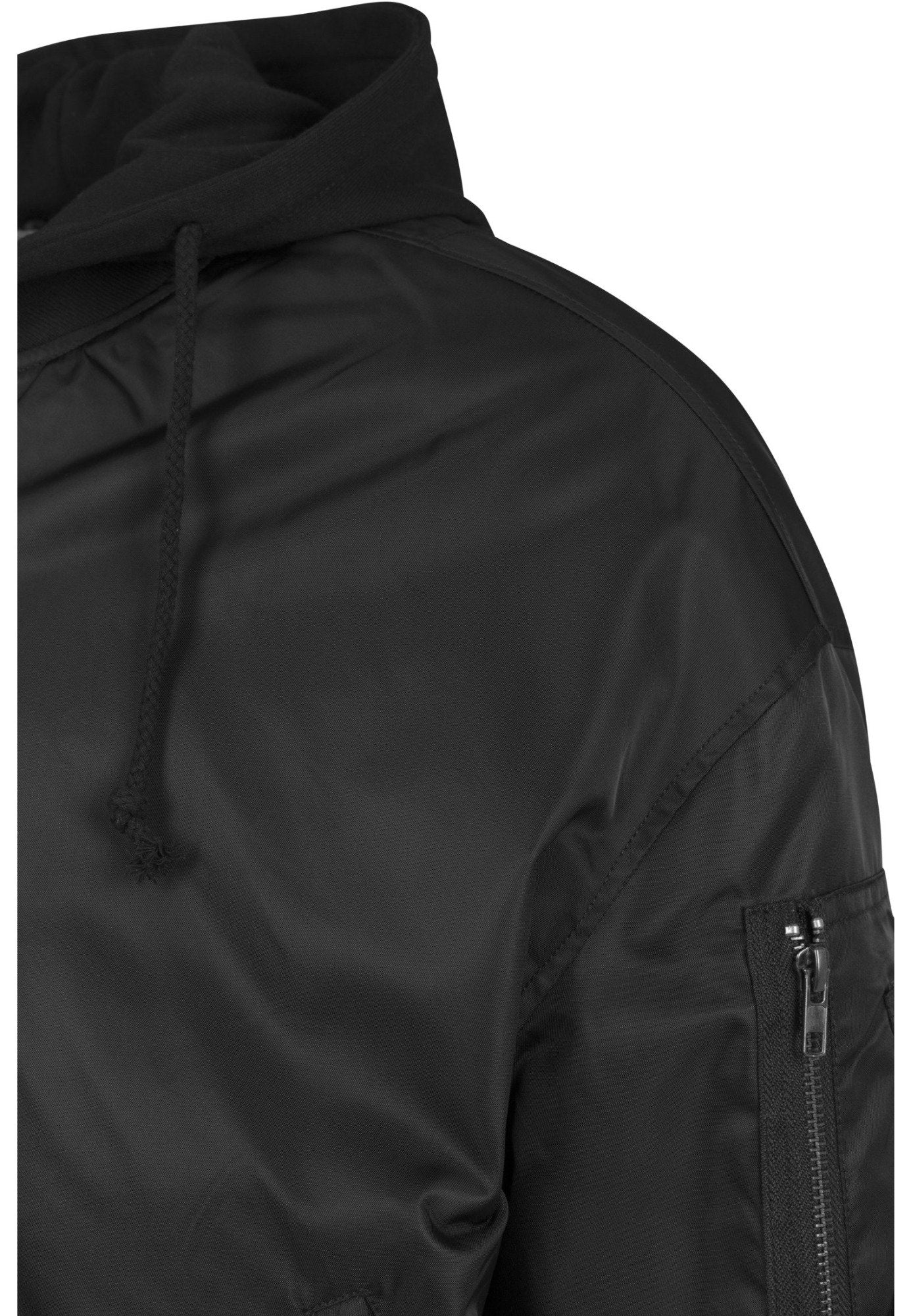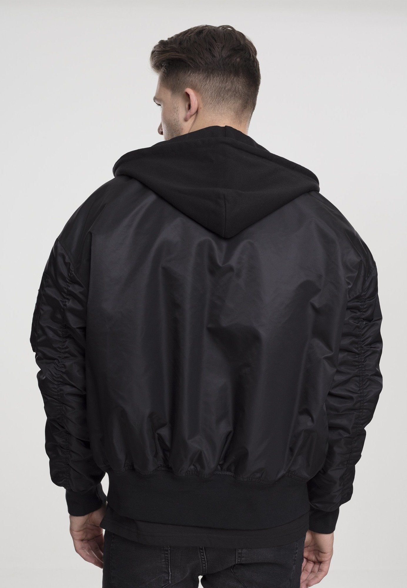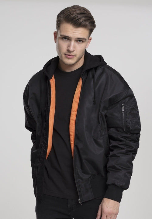 When two of the best urban looks come together, the result is the Hooded Oversized Bomber Jacket. The cool Bomber jacket combines classic details such as ribbed cuffs, zip pockets and a color-contrasting inner lining with the casual oversized cut. Top it off with a sweatshirt hood with drawstring and you have yourself a new favorite item. Brand: Urban Classics.