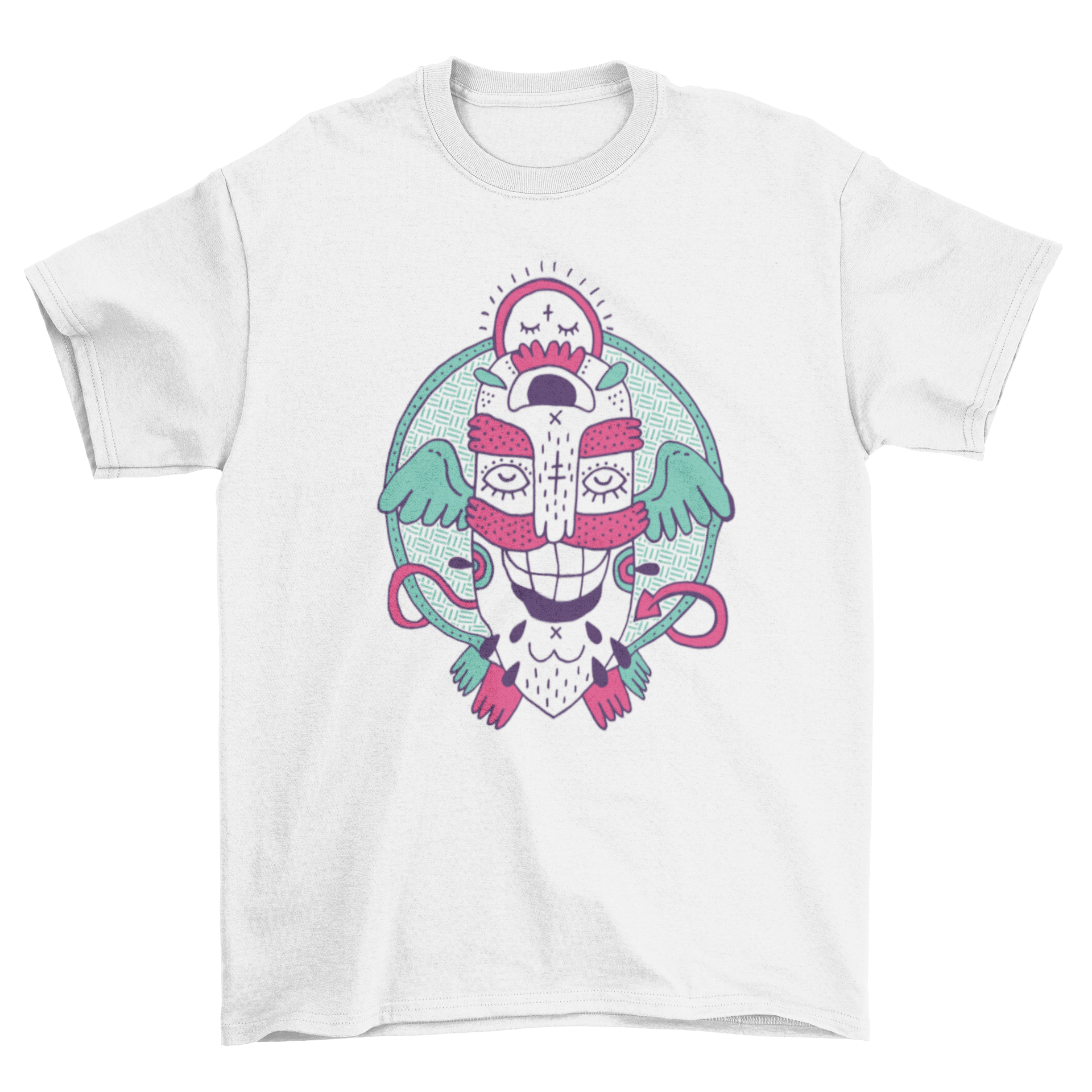 Fun Monster illustration in tones of pink and green.