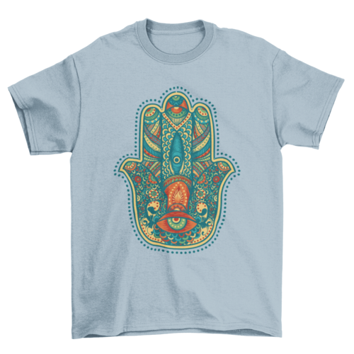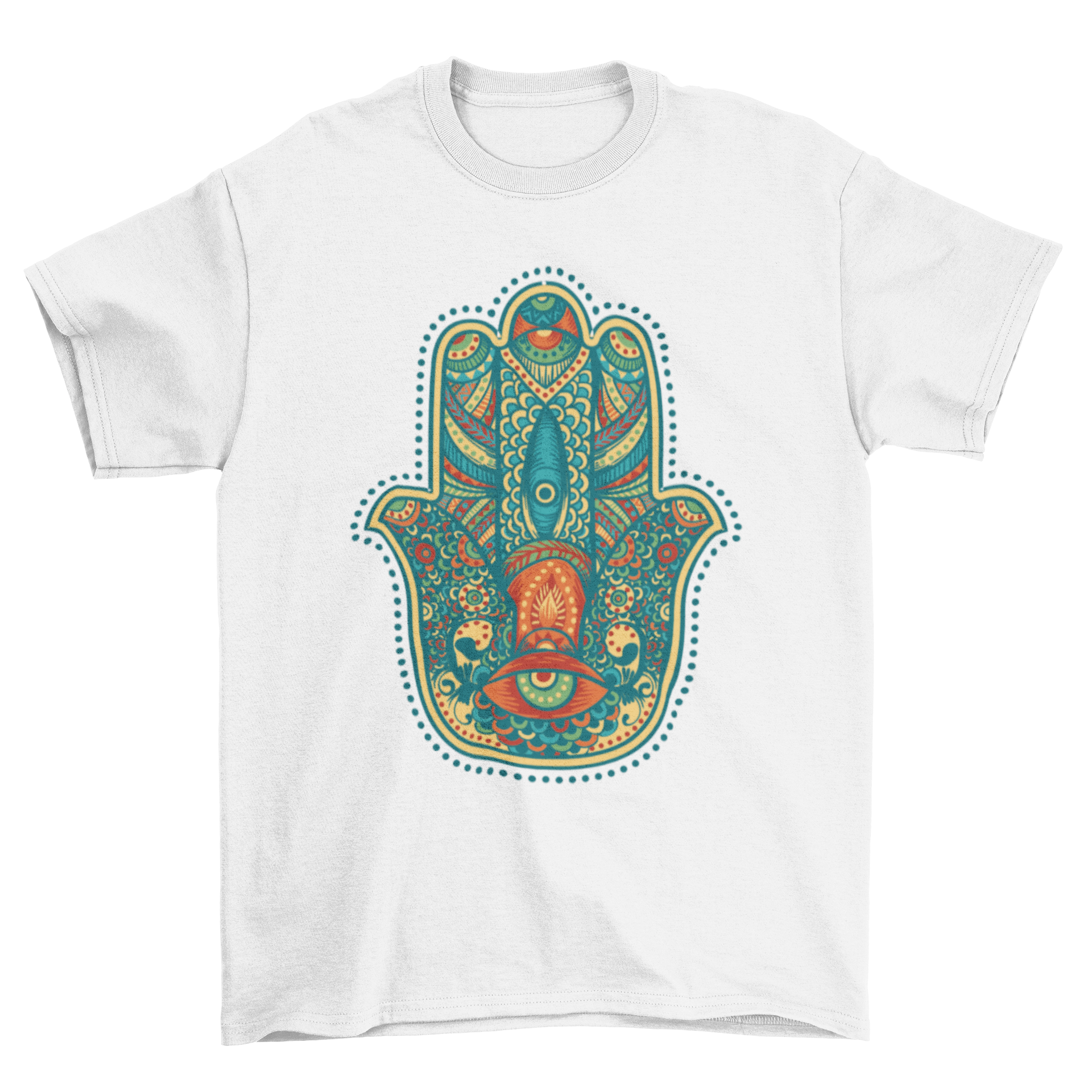 T-shirt design featuring a colorful illustrated Hamsa with lots of details and mandalas.
